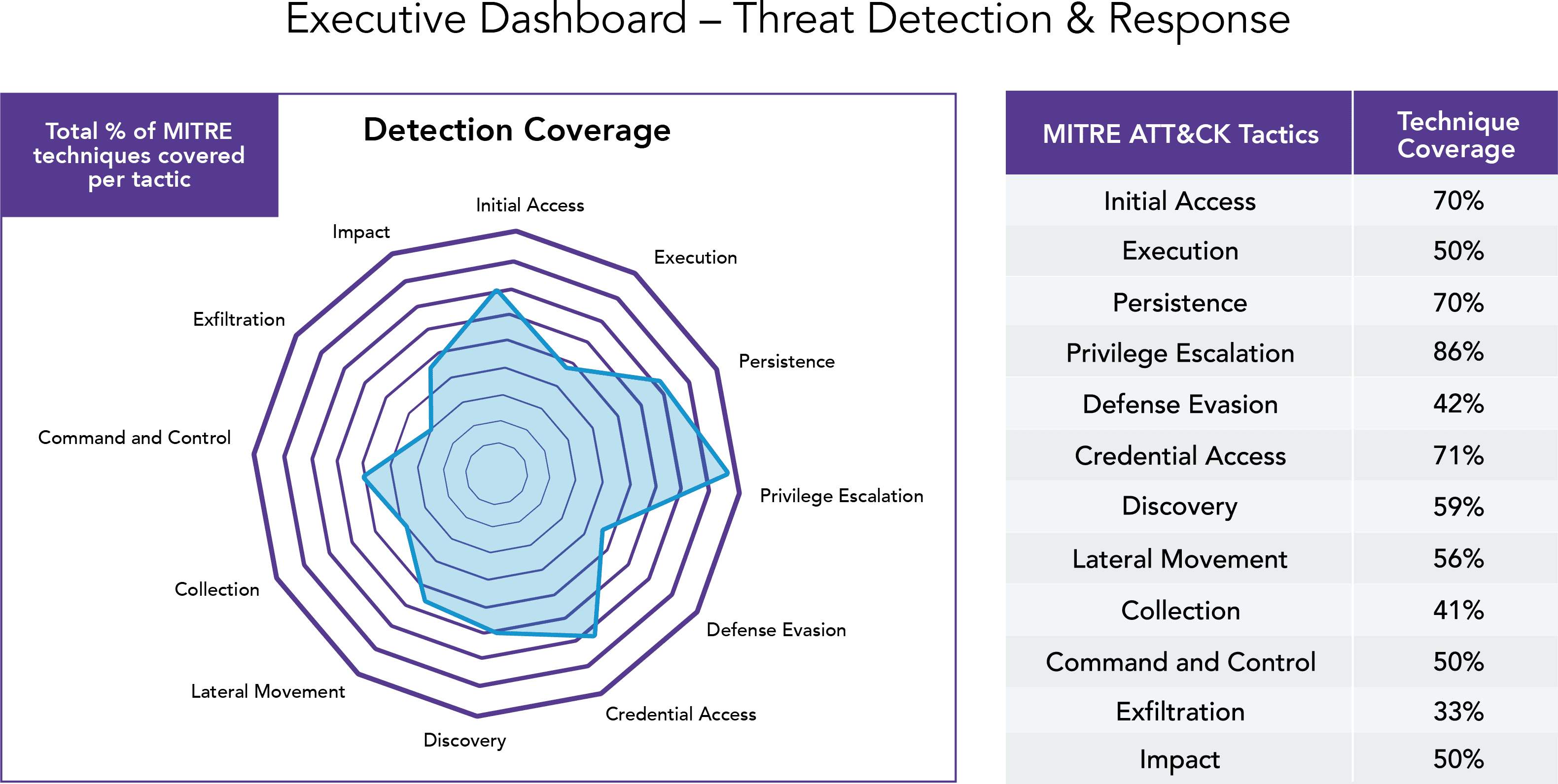 This graph shows an ECS customer’s coverage percentage for each MITRE ATT&CK TTP category. It doesn’t show the whole picture, but it’s a useful snapshot that provides fundamental metrics.