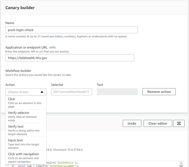 The final template is a GUI workflow builder that facilitates the creation of a sophisticated canary that can include simulated clicks, content verification via CSS selector or text, text entry, and navigation to other URLs: