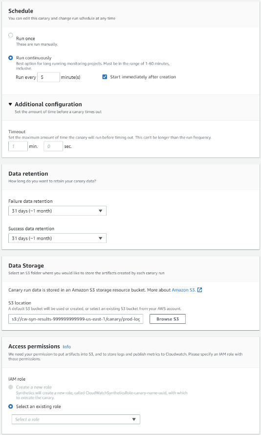 Additionally, it is possible to establish a schedule and data retention periods. A S3 bucket must be specified for storing the artifacts created each time a canary is run. An IAM role must be specified under which the canary will execute. Any additional required permissions can be configured by modifying the policies applied: