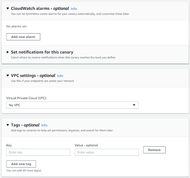 Costs – The AWS Free Tier allows 100 canary runs per month at no charge. After that, you pay per run, with prices starting at $0.0012 per run, plus the usual charges for S3 storage and Lambda invocations.