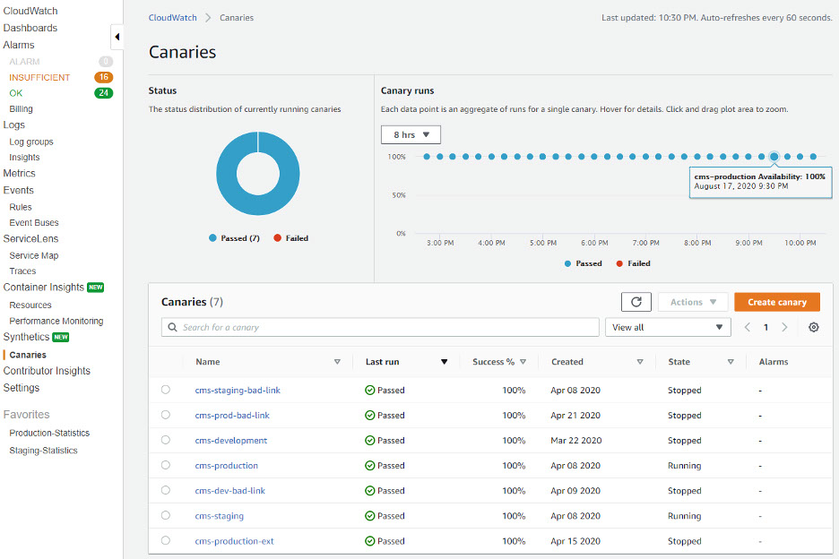 Open the CloudWatch Console and click Canaries to get started. The Canary runs section displays both the status of the Canary Runs that occurred in the last 8 hours (Configurable) and the data points. Each data point is an aggregation of runs for a single canary.