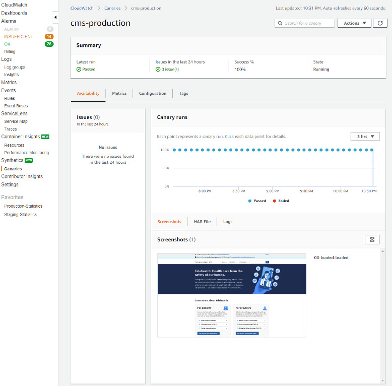 To reduce the mean time to resolution, CloudWatch Synthetics has multiple debugging artifacts including screenshots (stored in an S3 bucket), HAR (HTTP archive) files, and log files. The platform allows you to isolate alarming application endpoints and map them back to underlying infrastructure issues. It is also possible to use CloudWatch Synthetics to easily monitor both internal and public-facing endpoints. CloudWatch Synthetics lets you integrate endpoint monitoring in your CI/CD pipelines through support for AWS CloudFormation, AWS SDK, and CloudWatch Synthetics APIs.