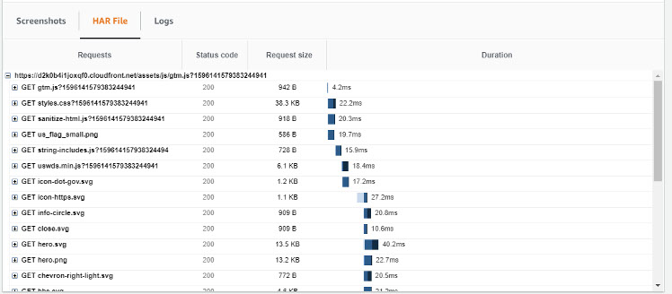 As can be seen in the Canary runs section, all the runs have passed. Further details of the canary run, such as the screenshots that were captured as part of each run, along with the HAR files and logs, can be viewed on the details section. Each HAR file contains a detailed log of the HTTP requests that were made when the canary was run, along with the responses and the amount of time that it took for the request to complete.