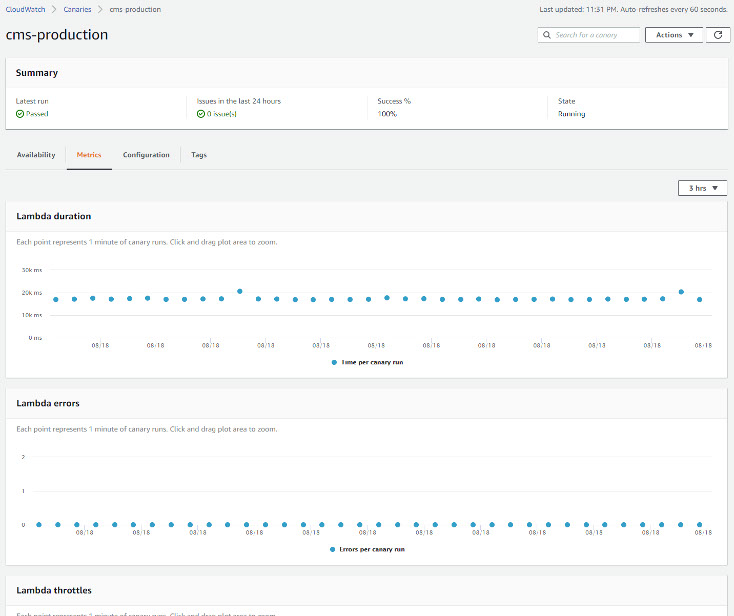 Because canaries are implemented using a Lambda function, the function’s execution metrics in can be viewed in the Metrics tab.