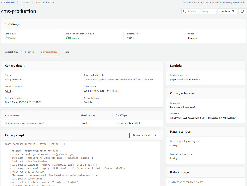 The canary script and other details can be viewed in the Configuration tab.