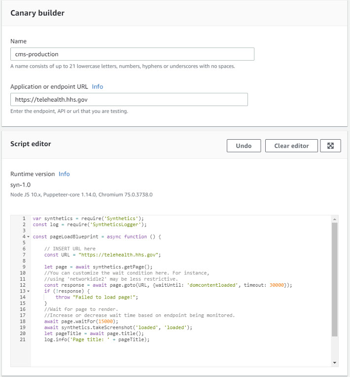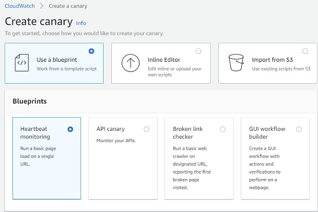 The process for creating a canary is quite intuitive. It is simply matter of clicking the Create canary button on the CloudWatch Synthetics console and following the prompts. It is possible to use one of four blueprints to create the canary, or to upload or import an existing one.