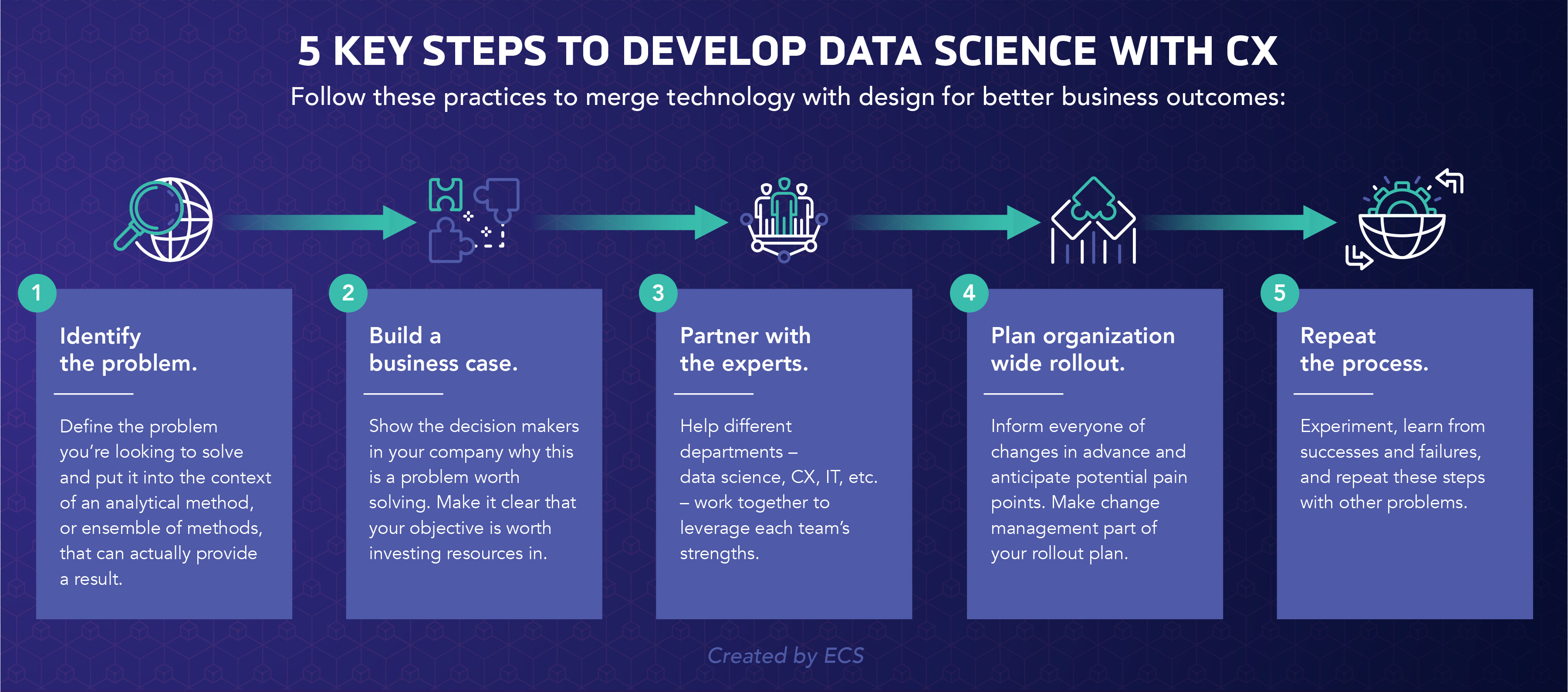 Data scientists and CX leaders have divergent but complementary talents. Data scientists are able to organize and synthesize complex information to draw conclusions that are valuable for an organization’s strategy. Yet while they are high on IQ, data scientists are not always so adept with EQ. In contrast, to be successful, CX professionals must design with empathy, developing a deep understanding of their customers and business processes through journey mapping. But they lack the highly technical skills data scientists possess.