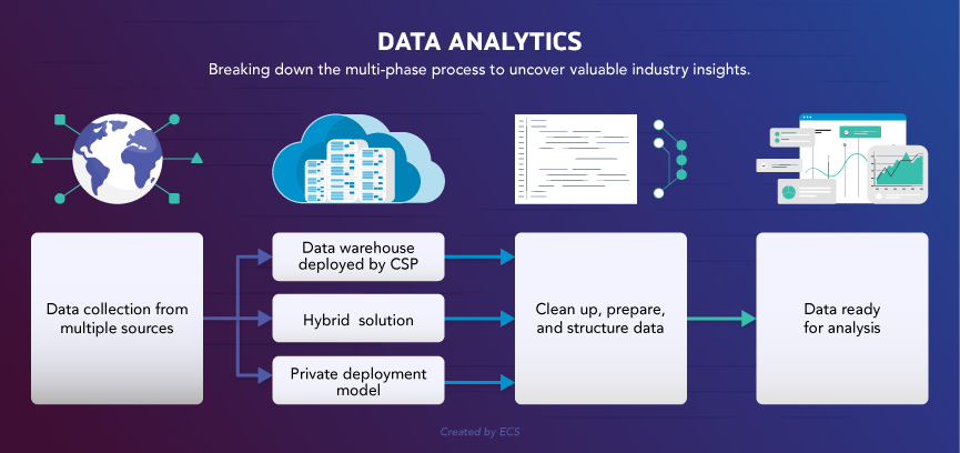 The phases of analytics can be characterized as data acquisition, data engineering, data science, and data consumption. Organizations can falter in any of these steps. They can fail to map the data correctly, conflate the business problem and misapply analytic solutions, or fall into the mire of analysis paralysis. While some companies may employ an internal team to perform in-house analysis, others turn to trusted solution providers like ECS who bring the experience and proven capabilities to meet their data analytics needs.