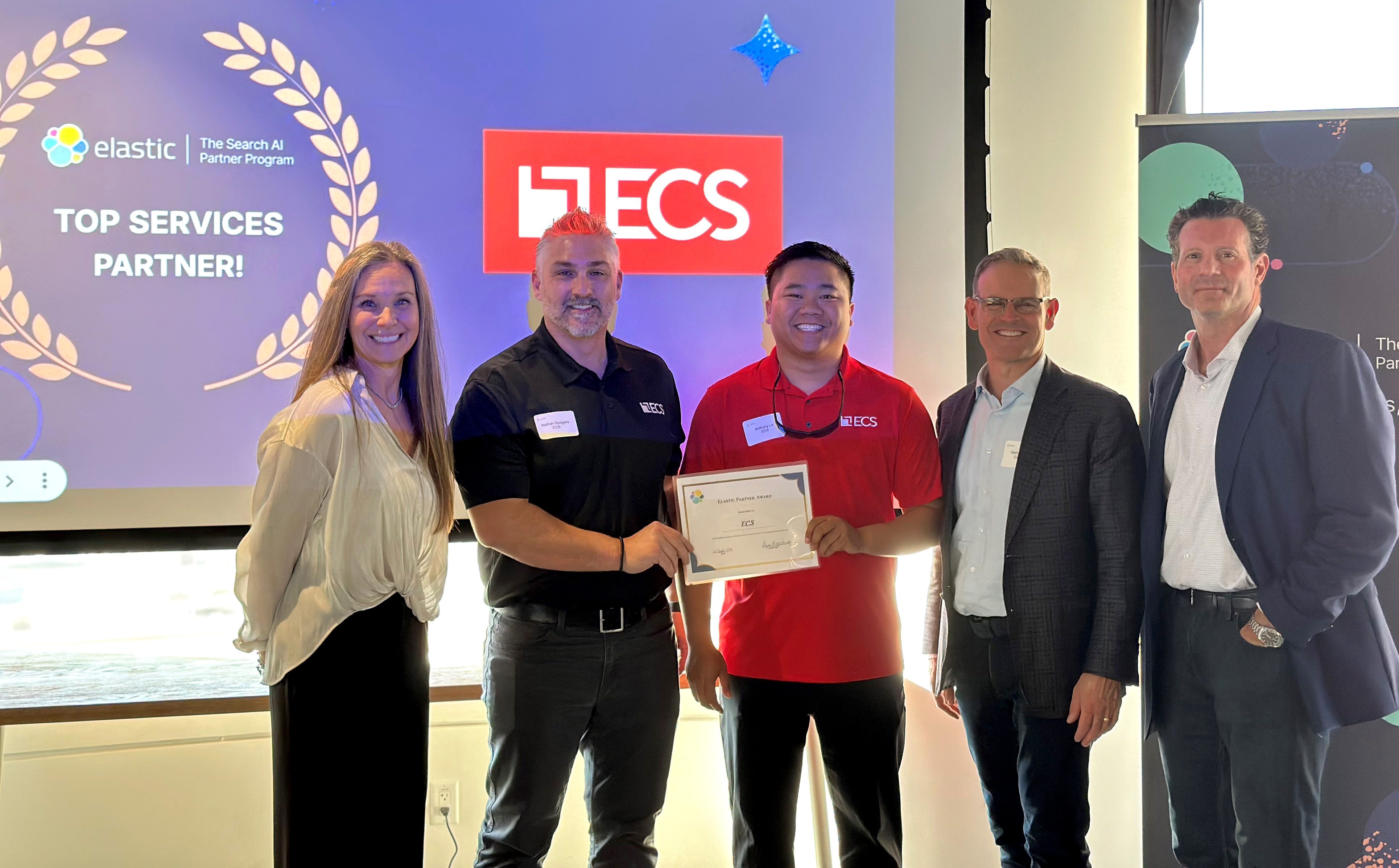 Receiving the Elastic Services Partner of the Year Award are ECS’ Account Executive Nathan Rogers (blue shirt) and Account Executive Anthony Le (red). With them are (from left) Elastic’s Global Vice President of Partner Sales Alyssa Fitzpatrick, Chief Revenue Officer Mark Dodds, and Senior Director of American Channel Sales Bill Sullivan.