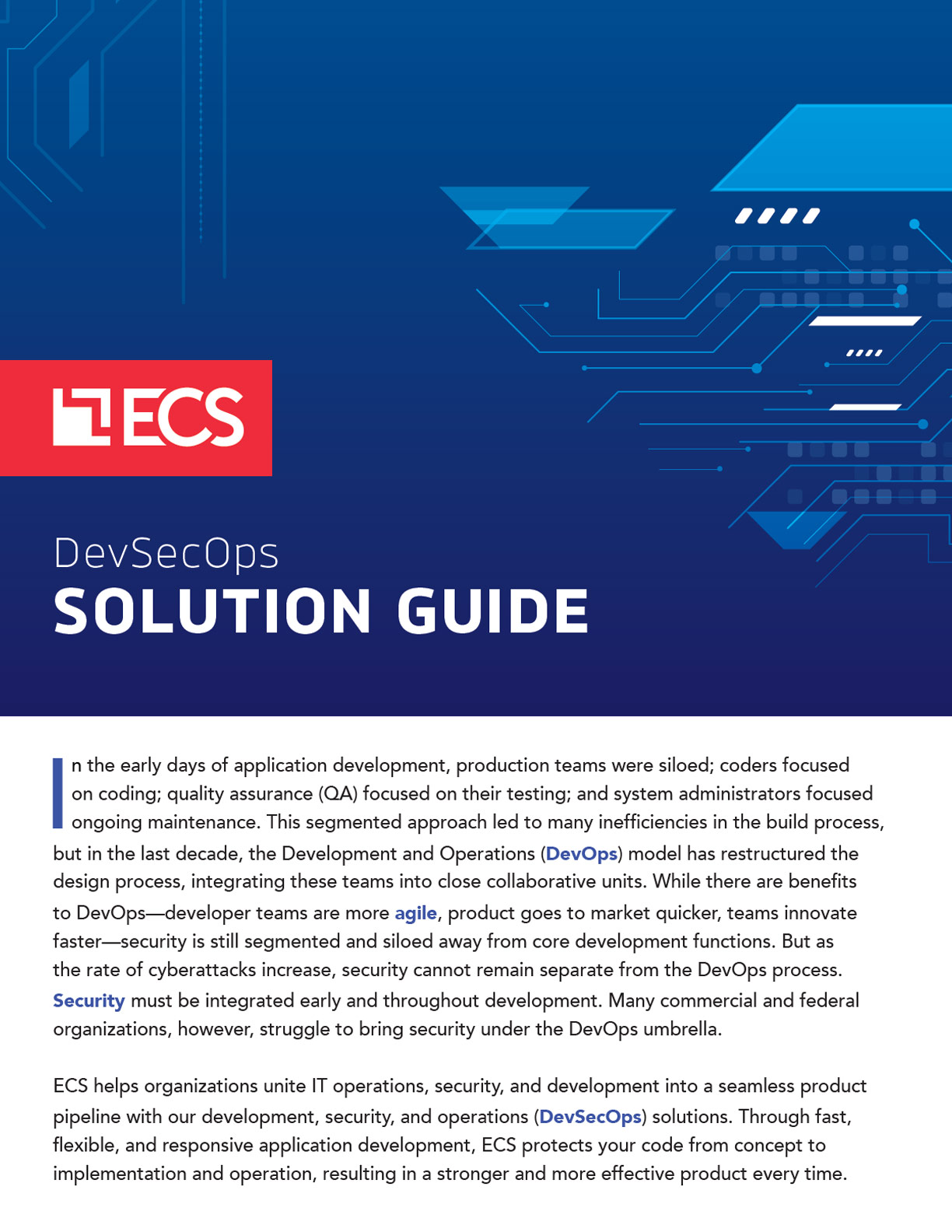 In the early days of application development, production teams were siloed; coders focused on coding; quality assurance (QA) focused on their testing; and system administrators focused ongoing maintenance. This segmented approach led to many inefficiencies in the build process, but in the last decade, the Development and Operations (DevOps) model has restructured the design process, integrating these teams into close collaborative units. While there are benefits to DevOps—developer teams are more agile, product goes to market quicker, teams innovate faster—security is still segmented and siloed away from core development functions. But as the rate of cyberattacks increase, security cannot remain separate from the DevOps process. Security must be integrated early and throughout development. Many commercial and federal organizations, however, struggle to bring security under the DevOps umbrella.