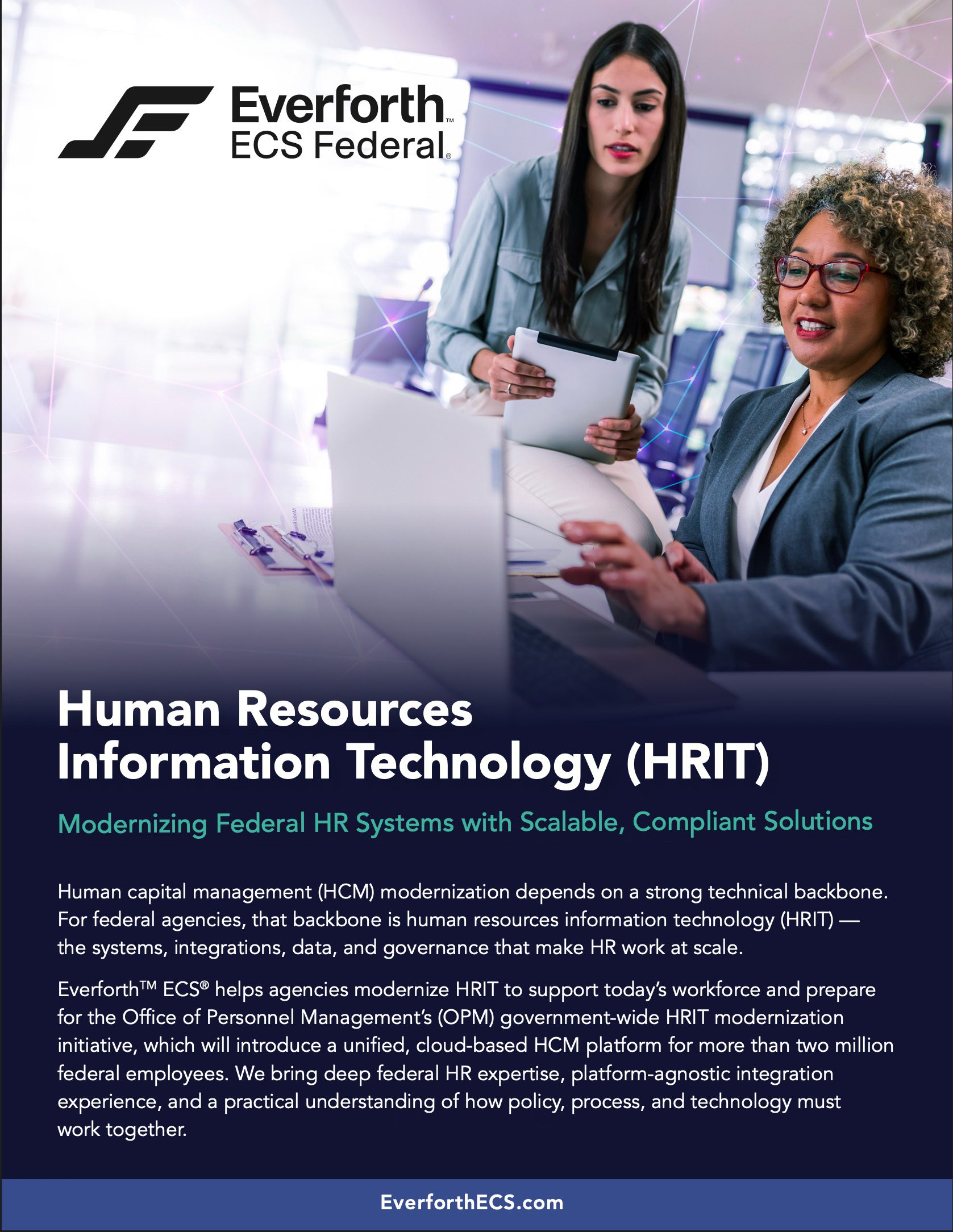 Federal HR environments require secure, compliant, and interoperable systems — needs that differ significantly from commercial deployments. Everforth ECS provides the technical foundation agencies need to transition smoothly to a modern HRIT environment, including: